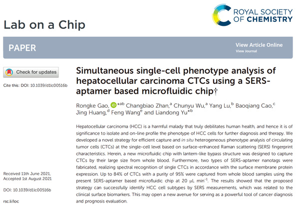 于连栋教授研究团队提出了一种基于多价适体识别技术的表面增强拉曼(SERS)-微流控芯片系统,在单细胞水平上对CTCs进行高效捕获和原位异质表型分析。其中,特殊设计的微通道包含三个功能单元:分离、捕获和原位分析单元。通过优化实验条件使该芯片的平均捕获效率达到84%,收集到的CTCs纯度高达95%,表明该系统能够从临床全血标本中高效捕获肝癌CTCs。同时,巧妙地利用SERS的“指纹图谱”特征,准确的评估临床标本中捕获到的CTCs上多种生物标志物的表达情况,以实现细胞异质性分析,这对于肝癌的早期筛查、转移和预后评估具有重要意义。