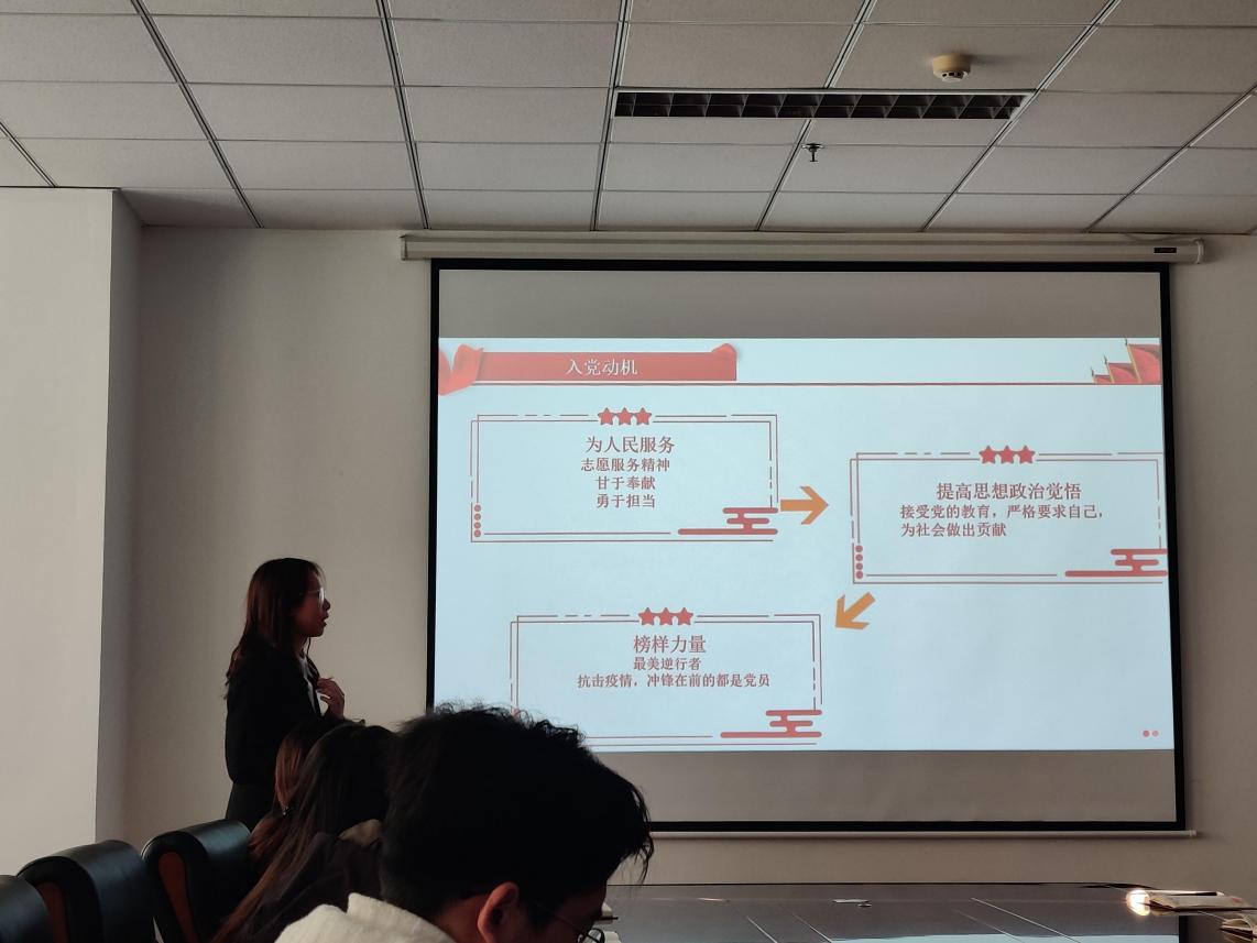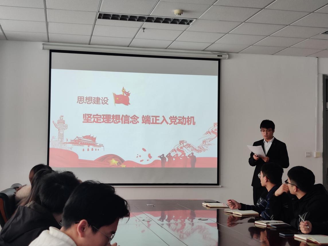会议分为两部分进行,首先由各积极分子答辩人汇报个人近期情况,介绍“一不四合格”完成情况、员工工作、学习科研、日常表现、宿舍卫生等个人表现,重点阐述自己的思想觉悟、入党动机及未来规划等。然后在每位答辩人答辩结束后,指定培养人及辅导员老师对该积极分子在一年培养期内的表现做出评价,并现场对该积极分子进行简单的提问考核,最后老师给出宝贵的意见和建议。