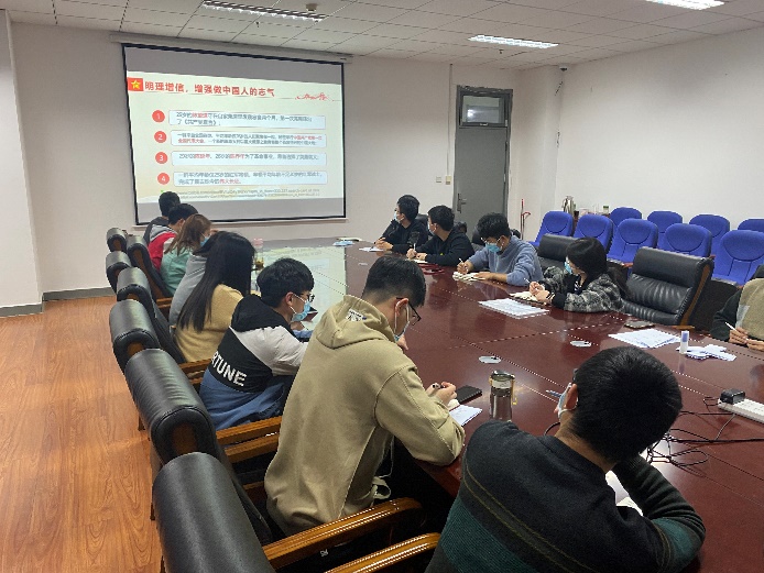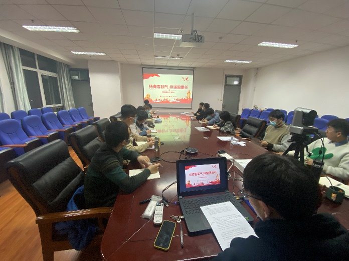 会议伊始,管子昊同志对本次组织生活作了简单介绍,支部成员一起观看了习近平总书记在庆祝中国共产党100周年大会上的讲话,习近平总书记强调:“新时代的中国青年要以实现中华民族伟大复兴为己任,增强做中国人的志气、骨气、底气。现如今国内疫情肆虐,国际形势极其不稳定,作为当代青年党员的我们,必须承担起强国建设主力军的角色。