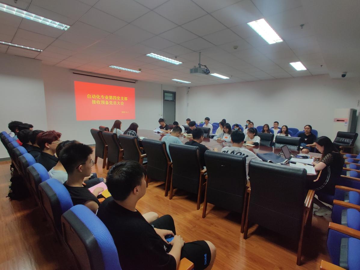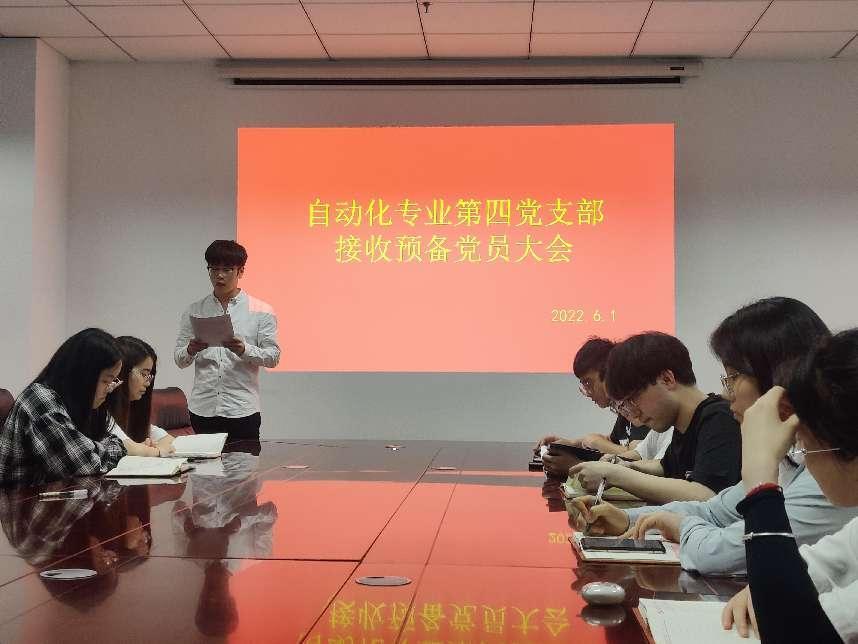 为响应党的号召,培养优秀党员,自动化专业第四党支部于2022年6月1日晚9点在工科E1329会议室召开支部大会讨论接收发展对象苗伟、高碧溶等九位同志为中共预备党员有关事宜。会议由党支部书记蔡玉颖同志主持,组织委员王晓萌同志作会议记录,所有党员、发展对象及入党积极分子悉数参加。