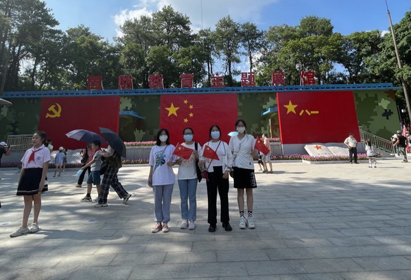 八一建军节期间,往来游园的游客络绎不绝。实践小队通过发放传单和讲解的形式对前来游园的人民群众讲解朱锡昂先辈的红色革命故事,发扬红色革命精神: