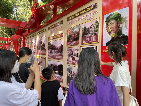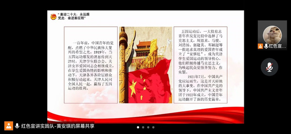 担任义务解说员的同学们声情并茂,向往来的游客们讲述着百年艰辛、风雨同舟的党史路,讲述着中国的红色政权从微小到壮大的坎坷历程,歌颂着中国共产党始终与人民心连心的深情厚谊。
