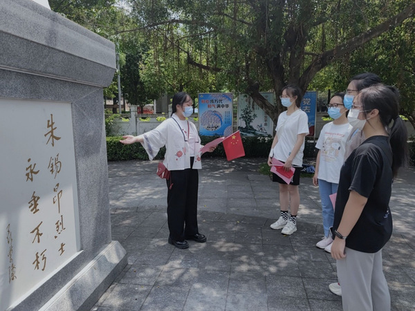 实践队于2022年8月1日前往玉林市人民公园内的朱锡昂烈士陵园,学习朱锡昂先辈的红色革命故事,并以发放传单与讲解相结合的方式对朱锡昂烈士的革命事迹与革命精神进行宣传讲解。