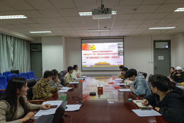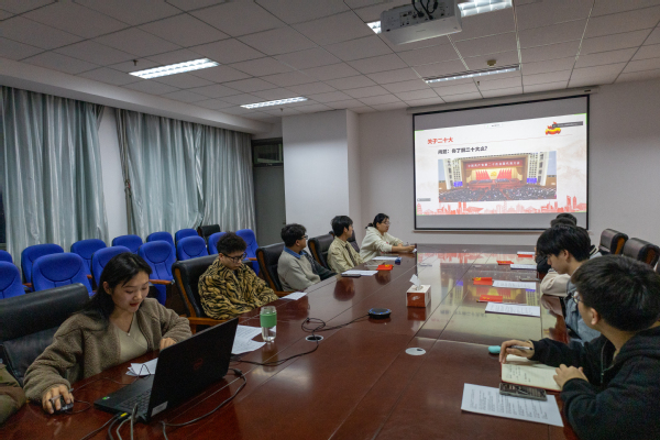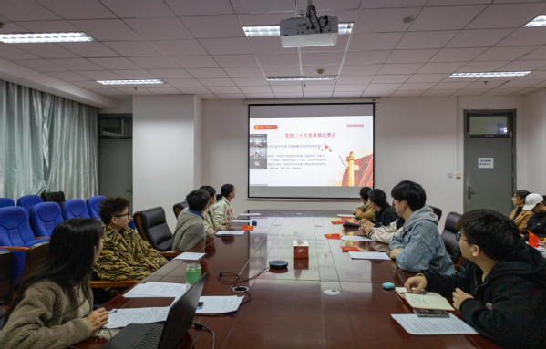 参会人员共同学习党的二十大精神。潘婷带领大家深入分析党的二十大报告,从“123”——“一个核心”、“两个行”、“三个务必”和“741”——“七大建设”、“四大保障”、“一个领导力量”两个角度为参会人员讲解了党的二十大报告中的有关内容。杨文可以“新思想,新征程”为主题带领大家学习二十大党章修改案,细致讲解《中国共产党章程》的百年历程、党的二十大党章修改的九个要点和突出特点,使参会人员全面了解党章的理论体系。