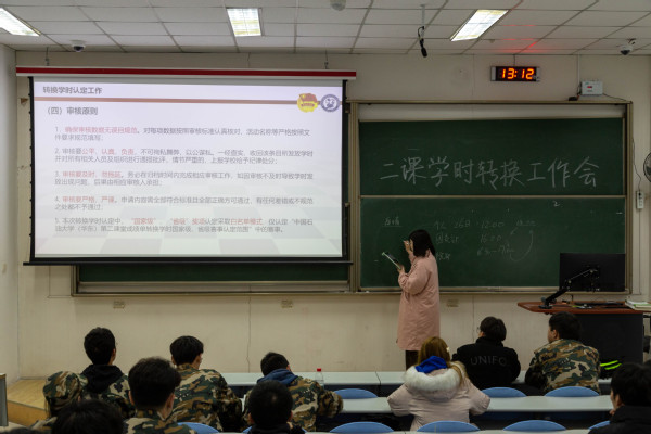 工作会伊始,周玥延老师对第二课堂进行简单介绍。接着,常亦乐从转换学时内容、转换学时通道开启时间、转换学时获得流程、审核原则、员工申请流程、团支部审核流程及注意事项、院部审核流程及注意事项等方面介绍了学时转换的主要情况。最后,她强调各班团支书要做好相关要求的传达工作以确保转换学时认定工作顺利进行。
