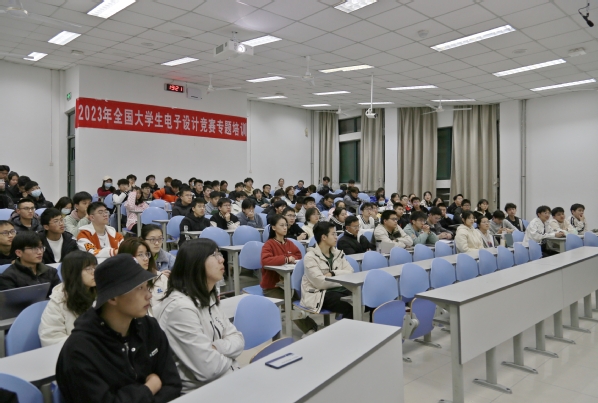 讲座伊始,周文浩从弱信号处理系统结构入手进行了详细的讲解,对曾经在省国电赛中出现过的弱信号处理赛题进行了简单的回顾,将实际问题分析与设计案例融入其中,对其中关键的电路设计问题给出了解决方案,将理论与实践结合。周文浩强调到,只有赛前的刻苦积累才能换来赛时的轻松应对,电路设计能力的提升不在一朝一夕,而是在长期的实践练习中得到升华。最后,他为参与本次培训的同学答疑解惑,并对今年参加国电赛的同学们给予了鼓励。