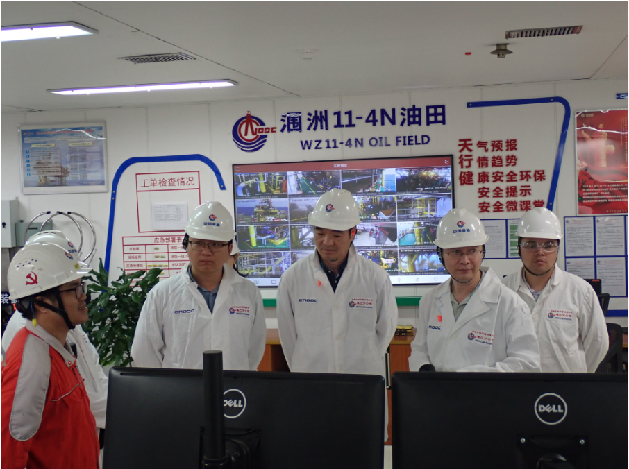 于连栋一行实地参观了涠洲 11-4NB油田海上钻井平台,详细了解钻采平台工艺流程、油气开发开采、油田数字化等情况。在交流环节,双方围绕党建业务结合、设备国产化、故障检测、智能机器人研发等方面进行了深入交流。