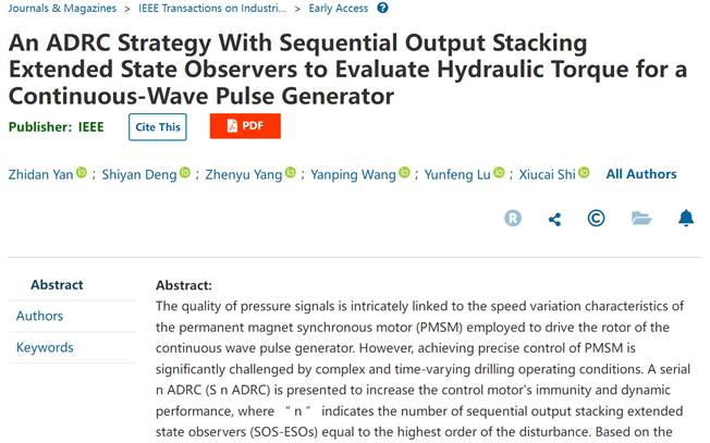 近日,公司鄢志丹教授团队在随钻高速传输研究领域取得新进展,研究论文《一种采用顺序输出叠加扩张状态观测器预估连续波脉冲发生器水力转矩的自抗扰控制器策略》(An ADRC Strategy with Sequential Output Stacking Extended State Observers to Evaluate Hydraulic Torque for a Continuous-wave Pulse Generator)发表于国际顶级、SCI 一区 TOP期刊IEEE Transactions on Industrial Informatics,该期刊2022-2023年影响因子为12.3,在CiteScore自动化与控制系统学科期刊排名中位列第一(1/286)。BB贝博艾弗森鄢志丹教授为论文通讯和第一作者,第二作者为2021级硕士生邓世琰,BB贝博艾弗森为第一单位。