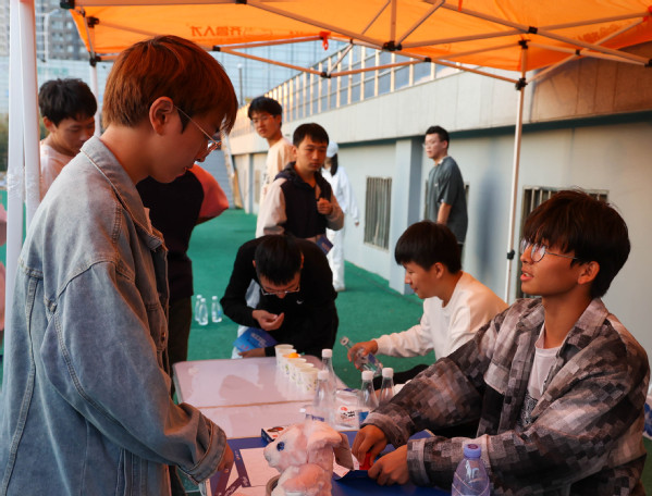 BB贝博艾弗森的摊位包括三种游戏:吹乒乓球、趣味保龄球,抛“绣球”。三种游戏同时进行,在吹乒乓球一项中,考验着同学们的技术、耐力和肺活量,参与人员需要将乒乓球一次性地从第一个纸杯吹到最后一个纸杯里。在趣味保龄球一项中,考验着同学们的臂力和掌控力,参与人员需要在固定位置将排球投出去,击倒至少8个瓶子。在抛“绣球”这一项目中,考验着同学们之间的团队合作,参与人员两人一组,互相组队,两人需要背对背站着并相隔一段距离,一位同学抛球,同时另一位同学需要及时用桶接住网球。