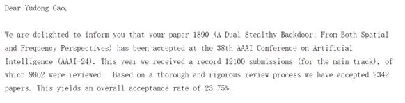 近日,公司陈鸿龙教授团队在人工智能安全领域取得新进展,相关研究论文 《A Dual Stealthy Backdoor: From Both Spatial and Frequency Perspectives》被第38届人工智能领域顶级会议AAAI 2024录用(高宇栋,陈鸿龙,孙鹏,李隽键,张安庆,王志波,刘伟锋)。该工作得到山东省优青项目、山东省泰山学者青年专家项目、国家自然科学基金面上项目等项目的资助。公司硕士研究生高宇栋为第一作者,陈鸿龙教授为通讯作者,BB贝博艾弗森为第一署名单位。