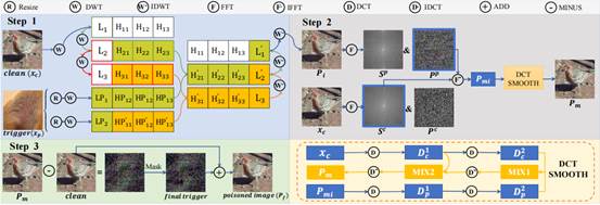 后门攻击(Backdoor)是人工智能模型中严重的安全威胁之一。被嵌入后门的模型会对包含触发器的输入做出错误预测,而在干净的输入上表现正常。先前的研究已经探索了后门触发器的隐蔽性来增强攻击有效性。然而,大多数研究只关注触发器在空间域的隐蔽性,而忽略了频域隐蔽性。这使得大部分含有触发器的有毒图像很容易被最近的防御方法检测到,尤其是从频域提出的防御方法。为解决上述问题,该研究提出了一种同时在空间域与频域隐形的双隐形后门攻击(Dual Stealthy Backdoor, DUBA),中文名称为毒霸。毒霸利用小波变换将触发器高频信息嵌入至干净图像中,再利用快速傅里叶变换与余弦变换擦除触发器在频域的痕迹,达到触发器在空间域与频域双重隐形的效果。大量的理论分析和仿真证明,毒霸优于现有后门攻击方法,并且可以绕过最新的后门防御系统,为后续后门防御的研究提供了新的思路。