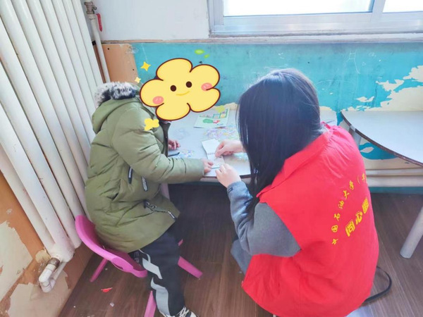 图4 志愿者陪小朋友贴贴画 刘宇豪摄