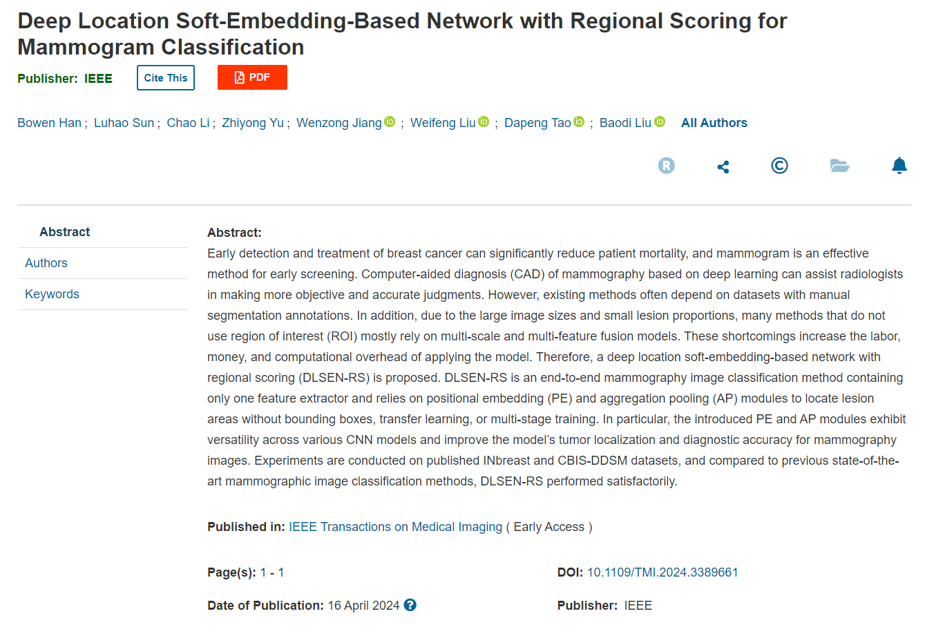 近日,公司刘伟锋教授团队在乳腺癌钼靶图像分类方面取得新进展,相关研究论文《Deep Location Soft-Embedding-Based Network with Regional Scoring for Mammogram Classification》在医学成像领域国际顶级期刊IEEE Transactions on Medical Imaging (IEEE TMI)上发表,该工作是与山东省肿瘤医院乳腺科合作完成,是人工智能与乳腺癌诊断的结合。公司刘宝弟副教授为通讯作者,2018级本研生韩博文和山东肿瘤医院2021级研究生孙芦浩为共同第一作者,BB贝博艾弗森为第一署名单位。
