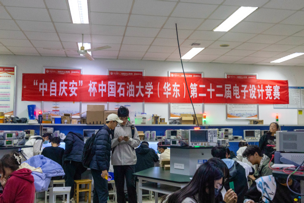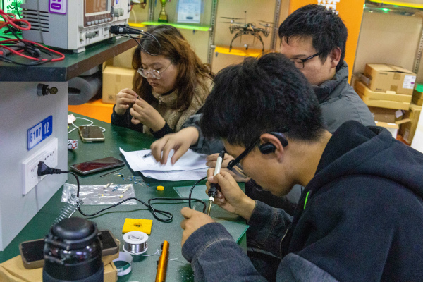 基础实验室里随处可见参赛同学埋头专心焊接的身影,同学们不断实践,求知若渴,积极向实验室中有经验的学长虚心求教。