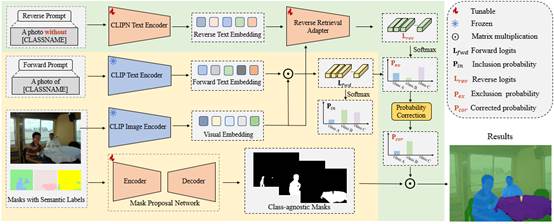 相关研究一:针对开放词汇语义分割领域现有前向方法模型存在类别不平衡的问题,提出用使用逆向思维,通过排除不可能的类别来缩小正向方法的选择范围,显著降低了误分类的风险。相关研究论文《Excluding the Impossible for Open Vocabulary Semantic Segmentation》被AAAI 2025录用(赵士远,刘宝弟,白雨,刘伟锋,邵帅)。该工作得到国家自然基金、山东省自然基金等项目的资助。公司硕士研究生赵士远为第一作者,刘宝弟副教授、2018级已毕业博士生邵帅为通讯作者,BB贝博艾弗森为第一署名单位。