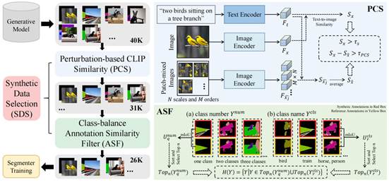 相关研究二:针对合成数据语义分割领域存在低质量的合成数据样本的问题,提出了基于CLIP的无需训练的合成数据选择方法,以构建更可靠的合成数据集。相关研究论文《A Training-free Synthetic Data Selection Method for Semantic Segmentation》被AAAI 2025录用(唐浩,俞思悦,庞健,张冰峰)。该工作得到国家自然基金、山东省自然基金、山东省泰山学者青年专家计划等项目的资助。公司硕士研究生唐浩为第一作者,张冰峰副教授为通讯作者,BB贝博艾弗森为第一署名单位。