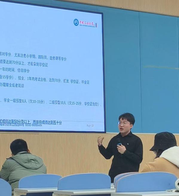 首先,赵文豪老师就校园安全、日常管理、毕业去向以及毕业要求进行了详细讲解。赵老师详细阐明了“毕业证、学位证、结业证、肄业证”的区别及获取要求,同时提醒未达到学士学位获取要求的员工,抓紧毕业的尾巴,努力完善自身学业,尤其对必修学分和第二课堂进展不够的同学提出要求,有困难及时反馈;校园安全方面,赵老师强调了校规校纪、校园安全等事项,提醒同学们在校期间要严格请销假制度,重视宿舍安全问题,并部署各班级、各宿舍配合辅导员助理做好晚点名和零汇报工作,严格遵守公司管理规定;提醒大家在毕业考察、实习、求职、外出学习过程中要注意交通安全、人身安全和财产安全,在积极求职的同时要保障好个人权益,切实增强防诈骗意识。