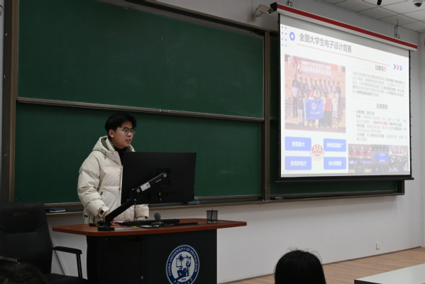 培训伊始,双创主席贾洪贺同学对电子设计类竞赛进行了全面介绍。他深入剖析了各类电子设计竞赛的特点、赛制以及比赛中常见的命题方向,为同学们梳理了电子设计竞赛所需的知识体系和技能要点,帮助大家对电子设计竞赛有了更清晰的认识,为后续备赛指明了方向。