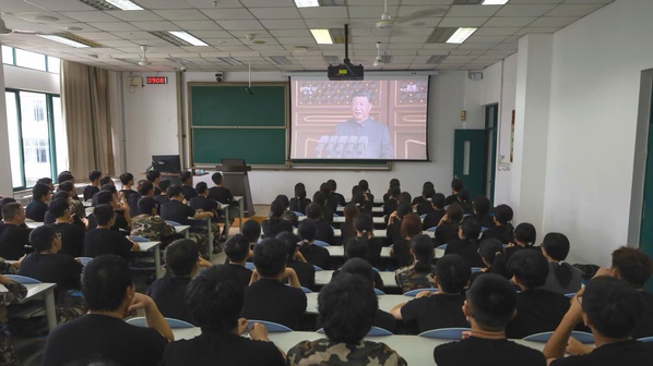 当日9时整,各观礼场地准时开启直播信号。公司教师代表齐聚工科E1304及1325教室,入党积极分子在南教316教室集中就座,25级新生则分别在南堂315、316教室有序观看,全体师生神情肃穆又难掩激动,静静等候仪式开始。