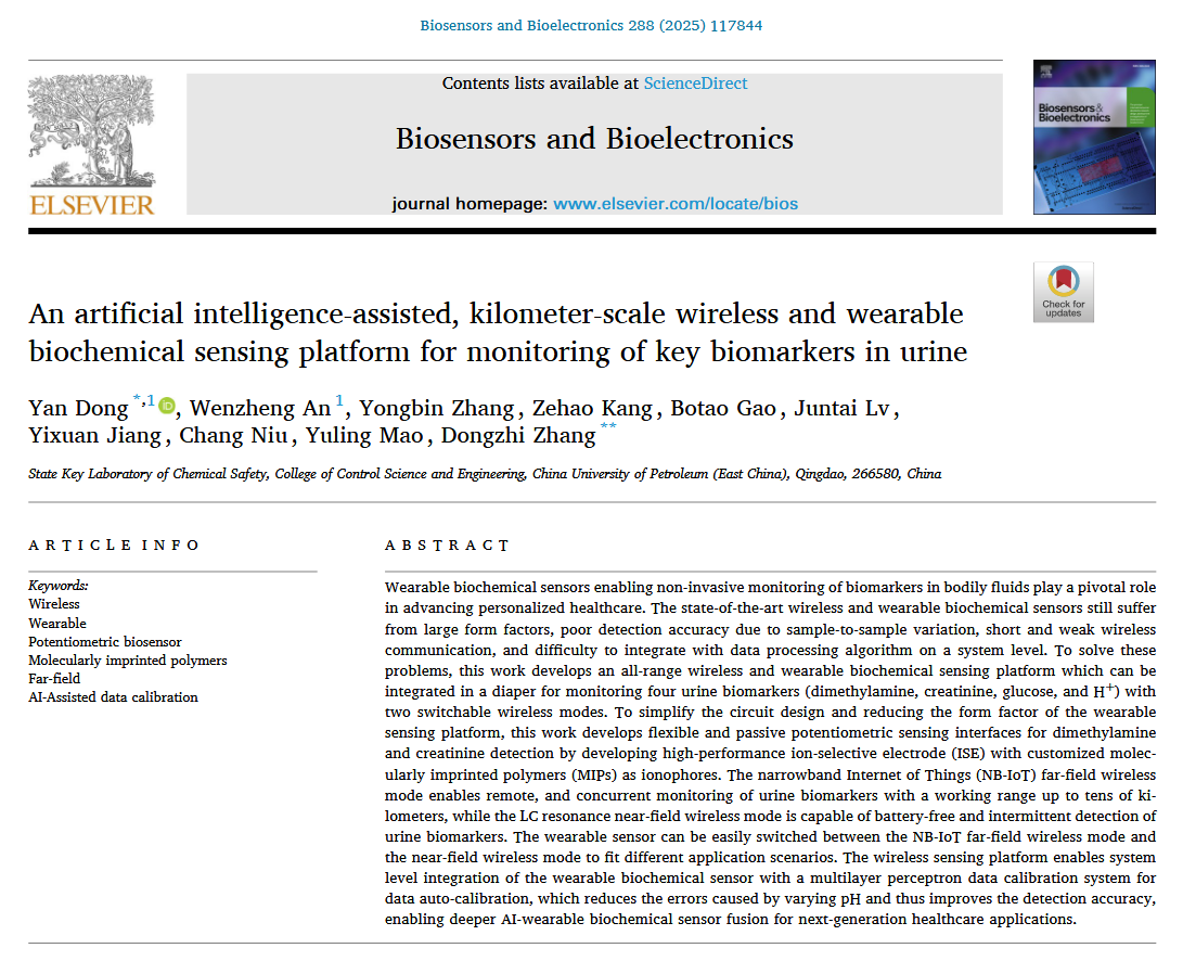 近日,公司董炎副教授在柔性无线可穿戴传感器方面取得进展,相关研究成果“An artificial intelligence-assisted, kilometer-scale wireless and wearable biochemical sensing platform for monitoring of key biomarkers in urine”发表在《Biosensors and Bioelectronics》。《Biosensors and Bioelectronics》是生物传感器领域的国际知名期刊,目前影响因子为10.5SCI一区)。论文第一作者为董炎副教授与人工智能专业2023级硕士研究生安文政,通讯作者为张冬至教授和董炎副教授,BB贝博艾弗森为唯一署名单位和通讯单位,该研究得到国家自然科学基金项目、山东省泰山学者项目、山东省海外优青等项目的资助支持。
