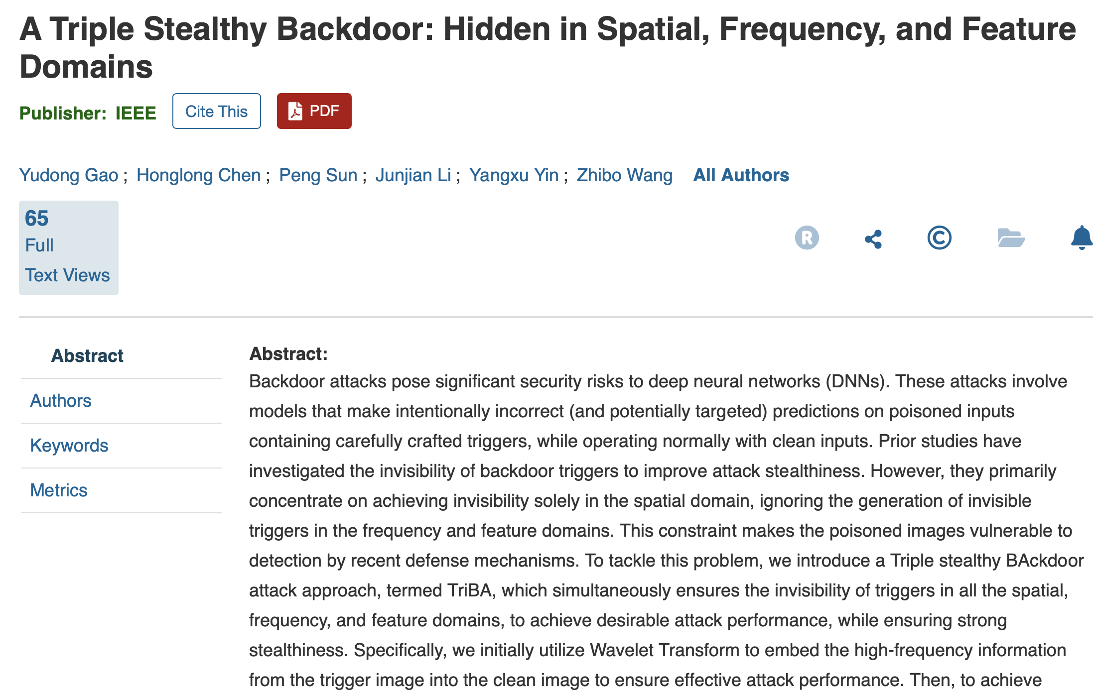 陈鸿龙教授团队在深度神经网络后门攻击防御方面取得重要进展,相关研究成果《A Triple Stealthy Backdoor: Hidden in Spatial, Frequency, and Feature Domains》一种三重隐形后门:隐藏在空间域、频率域和特征域)发表在国际顶级期刊《IEEE Transactions on Dependable and Secure Computing》。《IEEE Transactions on Dependable and Secure Computing》是计算机安全与可信计算领域的国际权威期刊,为CCF A类推荐期刊。论文第一作者为控制科学与工程专业2023级(本研19级)硕士研究生高宇栋,通讯作者为陈鸿龙教授,BB贝博艾弗森为第一署名单位和通讯单位,该研究得到山东省泰山学者青年专家项目(项目编号:tsqn202312133)、国家自然科学基金(项目编号:61772551、62111530052)以及山东省自然科学基金(项目编号:ZR2022YQ61)的资助支持。