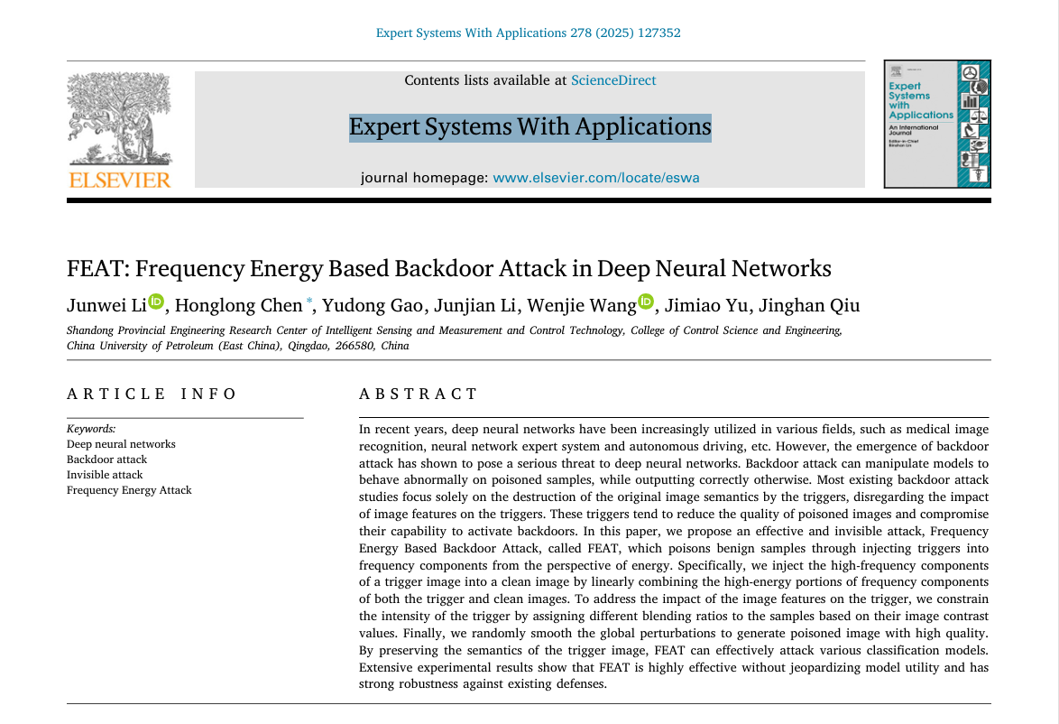 陈鸿龙教授在人工智能安全方面取得进展,相关研究成果FEAT: Frequency Energy Based Backdoor Attack in Deep Neural Networks发表在《Expert Systems With Applications》。《Expert Systems With Applications》是人工智能领域的国际知名期刊,目前影响因子为7.5(SCI一区)。论文第一作者为人工智能专业2022级硕士研究生李君伟,通讯作者为陈鸿龙教授,BB贝博艾弗森为唯一署名单位和通讯单位。该研究得到山东省泰山学者青年专家项目(项目编号:tsqn202312133)、山东省自然科学基金(项目编号:ZR2022YQ61、ZR2023ZD32)、国家自然科学基金(项目编号:61772551、62111530052)等项目的资助支持。