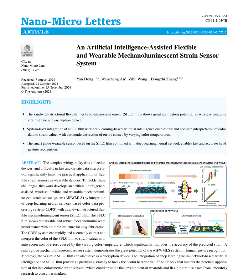 近日,公司董炎副教授在柔性可穿戴应变传感器方面取得进展,相关研究成果“An artificial intelligenceassisted flexible and wearable mechanoluminescent strain sensor system”(《人工智能辅助的柔性可穿戴力致发光比色应变传感器系统》)发表在《Nano-Micro Letters》。《Nano-Micro Letters》是微纳米技术领域权威期刊的国际知名期刊,目前影响因子为36.3(SCI一区)。论文第一作者为董炎副教授,通讯作者为董炎副教授和张冬至教授,BB贝博艾弗森为唯一署名单位和通讯单位,该研究得到国家自然科学基金项目、山东省泰山学者项目、山东省海外优青等项目的资助支持。