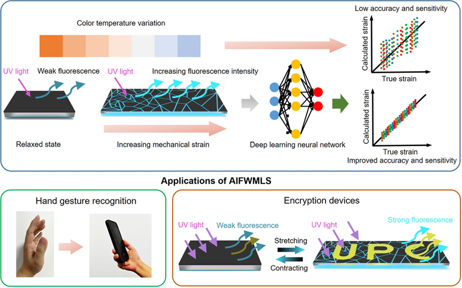 图2人工智能辅助的无线、柔性、可穿戴的力致发光比色应变传感器系统