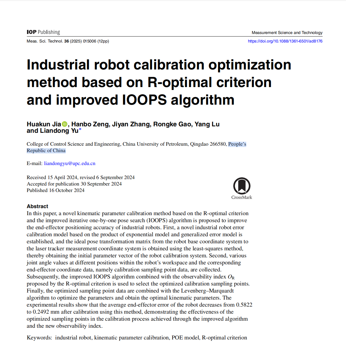 近日,公司测控系副教授贾华坤在工业机器人运动学参数辨识方面取得进展,相关研究成果“Industrial robot calibration optimization method based on R-optimal criterion and improved IOOPS algorithm”发表在《Measurement Science and Technology》。《Measurement Science and Technology》是测量科学与仪器技术领域的国际知名期刊,目前影响因子为3.4(中科院3区)。论文第一作者为贾华坤,通讯作者为于连栋教授,BB贝博艾弗森为唯一署名单位和通讯单位,该研究得到国家重点研发计划项目“多自由度非接触三维光学扫描仪”的资助支持。