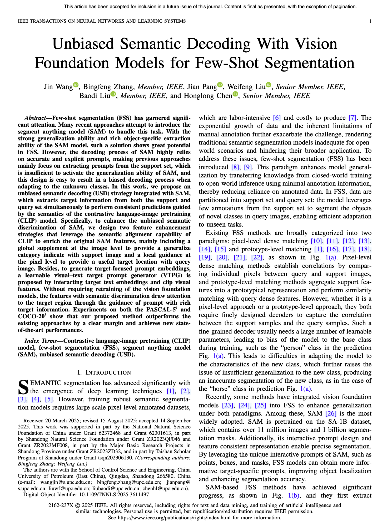近日,公司控制科学与工程专业2023级博士研究生王进在小样本分割方面取得进展,相关研究成果Unbiased Semantic Decoding With Vision Foundation Models for Few-Shot Segmentation发表在《IEEE TRANSACTIONS ON NEURAL NETWORKS AND LEARNING SYSTEMS》。《IEEE TRANSACTIONS ON NEURAL NETWORKS AND LEARNING SYSTEMS》是人工智能领域的国际知名期刊,目前影响因子为8.9(SCI一区TOP)。论文第一作者为王进,通讯作者为刘伟锋教授、张冰峰副教授,BB贝博艾弗森为唯一署名单位和通讯单位,该研究得到国家自然科学基金、山东省自然科学基金、山东省重大基础研究项目、山东省泰山学者计划项目的资助支持。