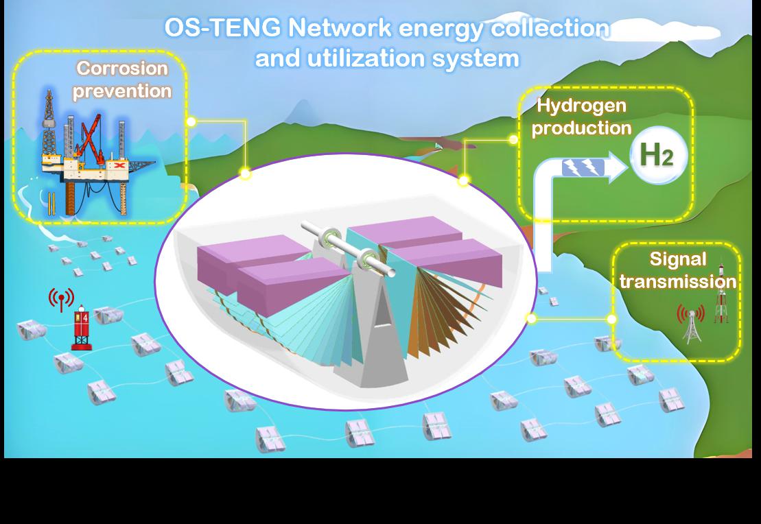 摩擦纳米发电机(TENG)因其坚固耐用、成本低廉及可扩展性等优势,已成为一种前景广阔的能源收集技术。本文受手风琴结构启发,研制了一种新型振荡水波能量收集装置(OS-TENG)。通过静电纺丝技术构建具有夹层结构的摩擦电材料,结合U型片层堆叠与阵列式类手风琴发电模块的协同设计,有效提升装置空间利用率,实现机械能向电能的高效转换。通过系统分析工作机制并优化弹性体角度等参数,该装置在3 Hz工况下可实现70 μA电流输出与124 mW/m²的功率密度,并在10天内保持卓越的电输出稳定性。凭借优异性能,OS-TENG可驱动LED灯、温度计及无线信号传输系统。更重要的是,该装置可应用于电化学过程,包括水电解制氢与金属阴极保护,可使304不锈钢电位降低250 mV,展现出显著的腐蚀防护效果。本研究为无外接电源的大规模水波能量收集与自驱动电化学应用提供了创新解决方案。
