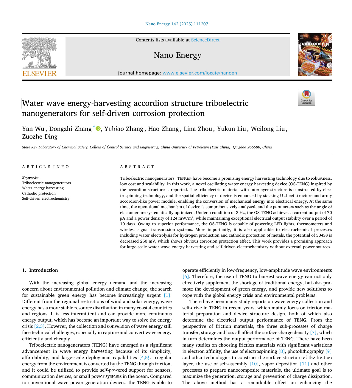 近日,公司张冬至教授团队在摩擦纳米发电机应用于自驱动防腐方面取得进展,相关研究成果Water wave energy-harvesting accordion structure triboelectric nanogenerators for self-driven corrosion protection发表在《Nano Energy》。《Nano Energy》是纳米发电机领域的国际知名期刊,目前影响因子为17.1(SCI一区)。论文第一作者为公司动力工程专业2023级博士研究生吴沿,通讯作者为张冬至教授,BB贝博艾弗森为唯一署名单位和通讯单位,该研究得到国家自然科学基金项目、泰山学者工程专项经费、山东省自然科学基金项目、青岛市自然科学基金项目、中央高校基本科研业务费专项资金,以及BB贝博艾弗森深部油气国家重点实验室开放基金项目的资助支持。