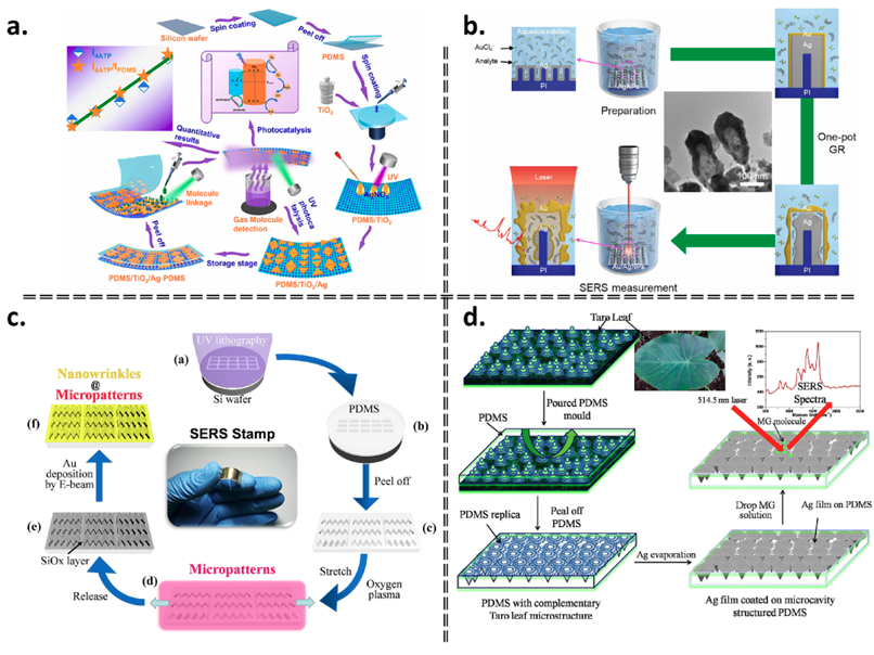 表面增强拉曼散射(SERS)因其灵敏检测和指纹识别能力而备受关注。在支撑基板上构建等离子体结构以集成 SERS 器件,已拓宽了其实际应用范围。与刚性支撑基材相比,柔性材料因其低成本、非侵入性和易于操作等优点,尤其适用于曲面样品,而备受关注。本文深入探讨了柔性 SERS 基材的最新进展,重点关注优化 SERS 信号增强的设计策略和实现大规模生产的制造技术。我们介绍了两种操控柔性 SERS 基材热点分布的新方法,这是提高信号灵敏度和重现性的关键因素,而以往综述中对此研究尚不充分。此外,我们还全面概述了基于各种柔性材料的 SERS 基材,包括聚合物、纤维素和其他生物材料,以及它们的典型制造方法。 本综述还重点介绍了 FSS 在生物传感器、食品农药原位检测、环境污染物监测和微流控技术中的前沿应用,并着重强调了实际应用挑战,如基材均匀性、稳定性和可扩展性。相信本综述将帮助材料、纳米光子学和 SERS 相关领域的科研人员设计和开发具有高灵敏度和简单可重复性的新型 FSS,以应用于化学和生物传感的实际场景。