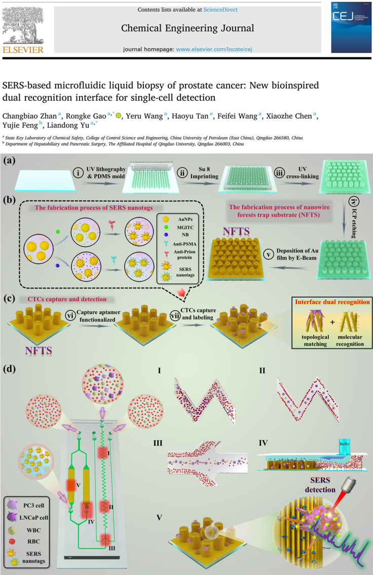 近日,公司控制科学与工程专业2022级博士研究生占昌标在CTCs痕量捕获以及原位SERS光谱测量方面取得进展,相关研究成果《SERS-based microfluidic liquid biopsy of prostate cancer: New bioinspired dual recognition interface for single-cell detection》发表在《Chemical Engineering Journal》。《Chemical Engineering Journal》是材料科学领域的国际知名期刊,目前影响因子13.2(SCI一区)。论文第一作者为占昌标,通讯作者为于连栋教授、高荣科教授,BB贝博艾弗森为第一署名单位和通讯单位。