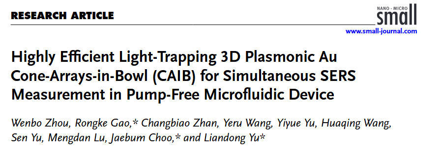 近日,公司控制科学与工程专业2022级博士研究生周文博在痕量重金属离子检测方面取得进展,相关研究成果《Highly Efficient Light-Trapping3D Plasmonic Au Cone-Arrays-in-Bowl (CAIB) for Simultaneous SERS Measurement in Pump-Free Microfluidic Device》发表在《Small》。《Small》是纳米科学与纳米技术领域的国际知名期刊,目前影响因子为12.1(SCI二区)。论文第一作者为周文博,通讯作者为于连栋教授、高荣科教授和韩国中央大学Jaebum Choo教授,BB贝博艾弗森为第一署名单位和通讯单位,(韩国中央大学为第二署名单位和通讯单位),该研究得到国家自然科学基金区域创新发展联合基金的资助支持。