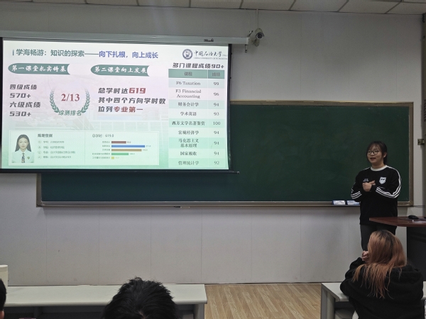 会计学2301班陈楚佳妮同学则带来了“在多元实践中解锁青春可能”的精彩分享。她手握2项国家级、2项省市级、6项校级奖项,荣获第二十三届“思美之星”称号。在学业发展上,陈楚佳妮提出“打破信息差”的理念,建议大家提前调研学科资源、赛事动态,在充分了解的基础上精准发力。科创方面她参与的大创项目成果丰硕;志愿服务与社会实践中,她坚持红色传承,带领团队成为校标杆实践队;员工工作里,她身兼班级团支书、经管公司员工会主席团成员等多职,同时还活跃在校史宣讲、主持比赛、辩论队等校园文化阵地。