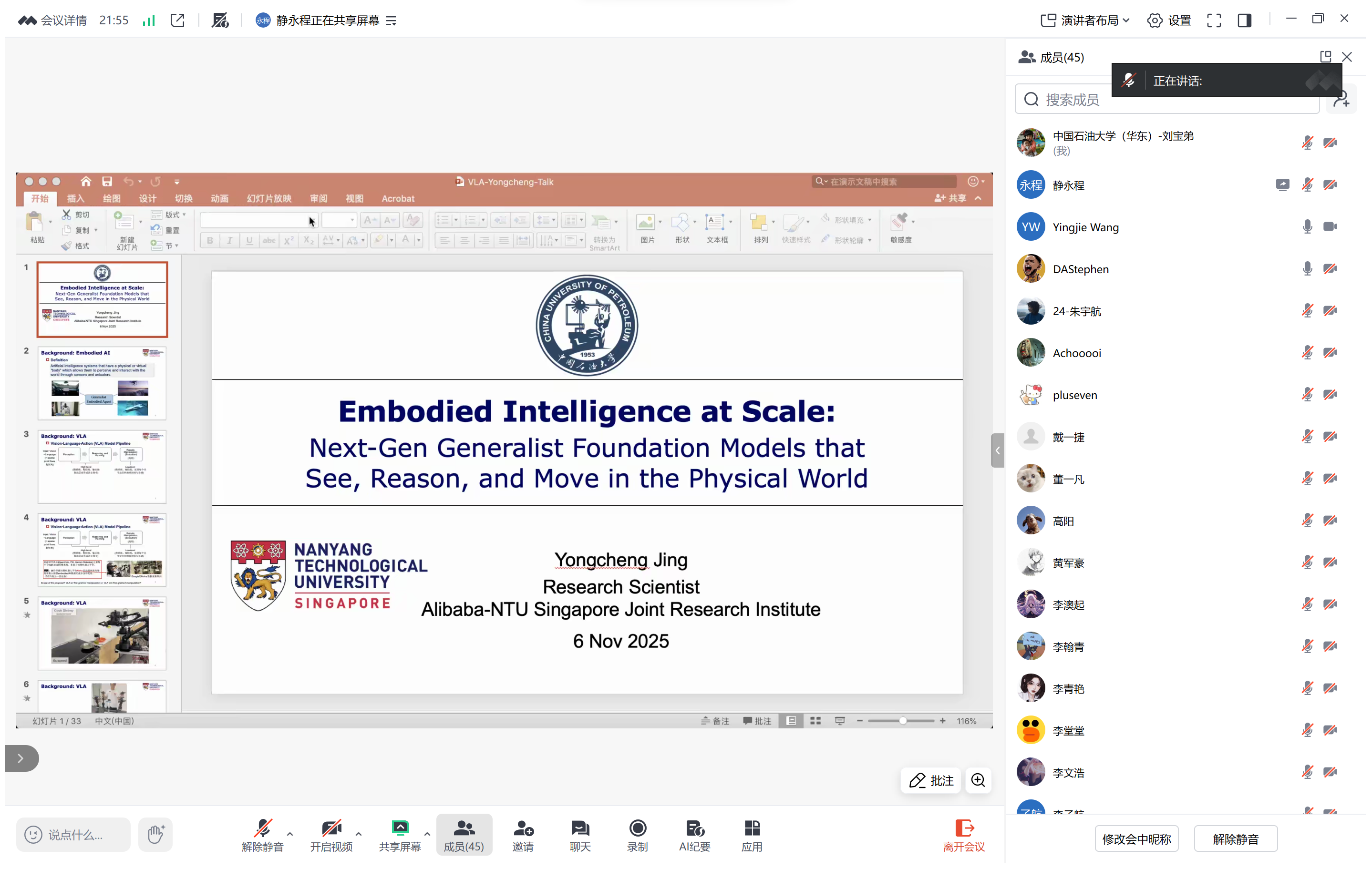 2025年11月6日晚,BB贝博艾弗森BB贝博艾弗森成功举办“具身智能”主题线上学术报告。本次讲座特邀新加坡南洋理工大学研究科学家静永程博士,围绕“具身智能规模化发展:下一代通用基础模型在物理世界中的感知、推理与行动”展开深入讲解,吸引了公司广大师生在线参与。