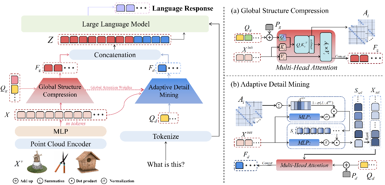 3D视觉-语言模型高效压缩方向,团队与香港理工大学合作完成的《HCC-3D: Hierarchical Compensatory Compression for 98% 3D Token Reduction in Vision-Language Models》实现了高效人工智能与3D视觉理解的创新结合。公司张冰峰副教授为通讯作者,2024级硕士生张立恒为第一作者,中国石油大学(华东)为第一署名单位。3D视觉理解在人工智能领域具有重要应用价值,当前3D视觉-语言模型能够实现点云数据与文本的多模态推理,然而现有方法面临巨大的计算开销限制其实际应用。研究发现计算瓶颈主要在于大语言模型需要处理大量的3D视觉tokens,由于点云数据的不规则分布导致信息密度不均,简单的token压缩往往会造成严重的性能下降。为此,团队提出了层次化补偿压缩方法(HCC-3D),采用全局结构压缩(GSC)和自适应细节挖掘(ADM)的双路径架构。GSC使用可学习的3D空间查询通过多头注意力机制实现整体压缩并保留基本几何结构,ADM则通过注意力引导的选择机制动态识别被全局压缩忽略但信息丰富的区域,并使用专门的细节查询进行再压缩。这种分层设计使HCC-3D能够将3D特征压缩至仅12tokens,实现约98%的压缩率,相比现有方法显著减少了训练时间,同时层次化互补机制有效降低了压缩过程中的信息损失,在多个下游任务中保持了高质量表现。